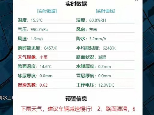 雨天情況下,其天氣現(xiàn)象,濕滑系數(shù)、路面狀況均會顯示紅色字體,及相關(guān)數(shù)據(jù)信息,并且有預(yù)警信息,提醒:下雨天氣,路面濕滑,建議車輛減速慢性,注意行車安全,并且有限速提醒。