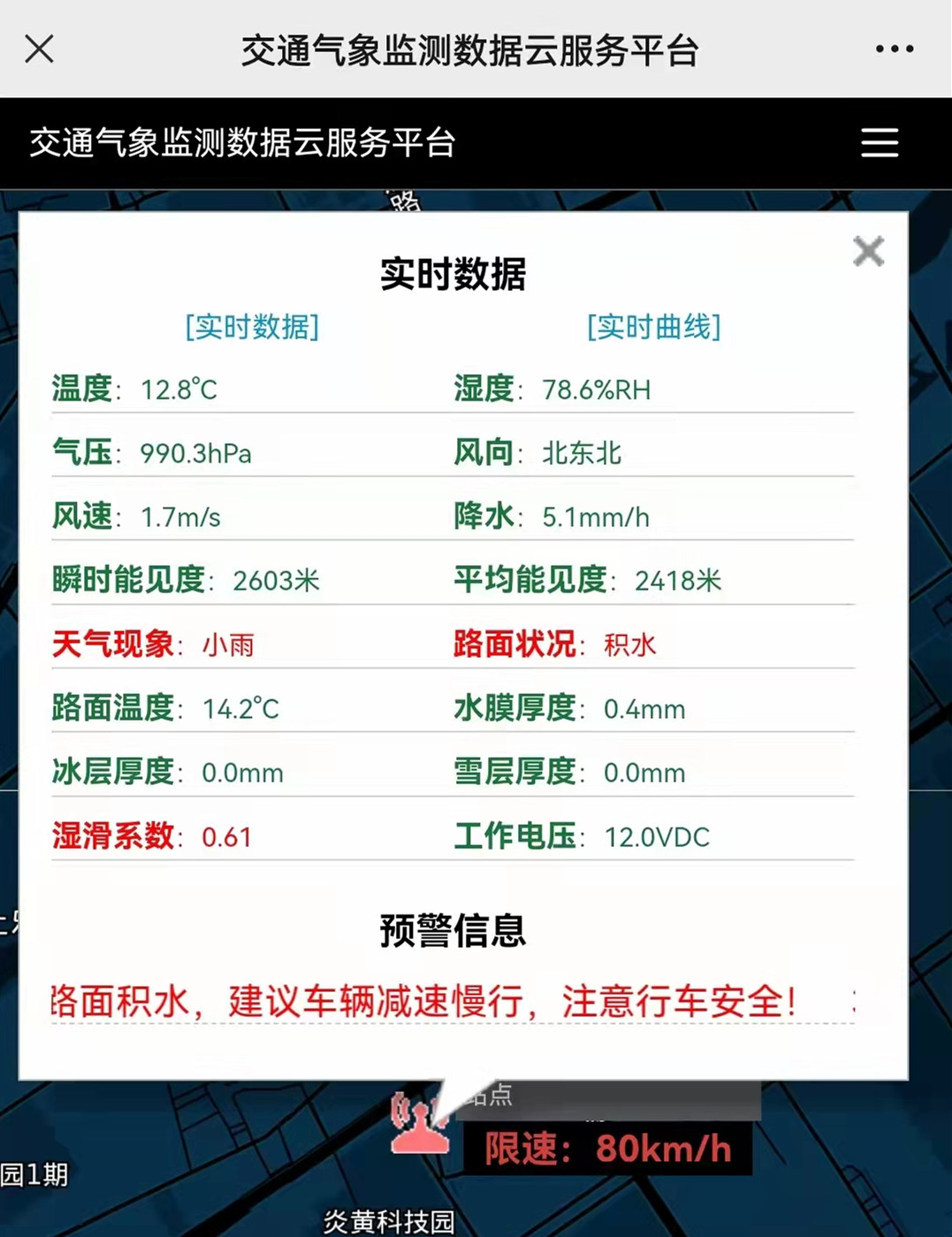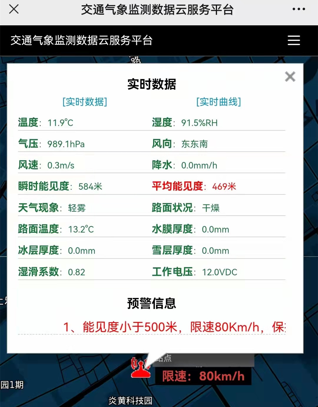 霧天情況下,在實時數(shù)據(jù)中對于平均能見度會顯示紅色字體,其能見度距離也有具體展現(xiàn),并提示預(yù)警信息:能見度小于多少米,限速多少,保持車距等相關(guān)提醒。
