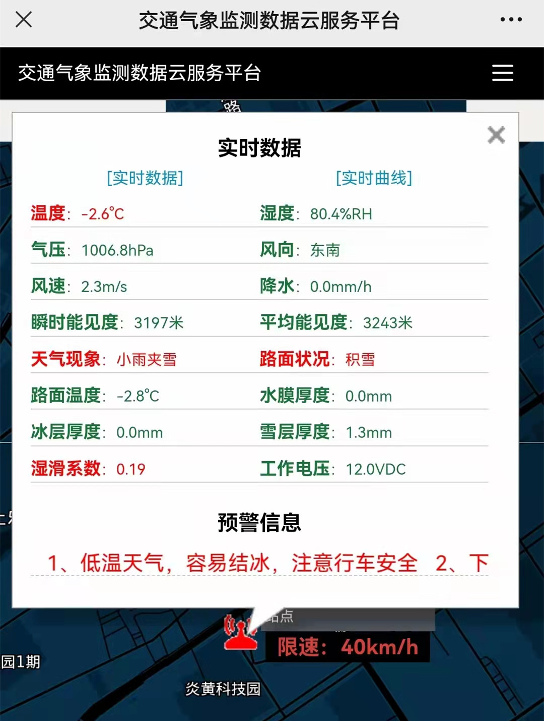 下雪天,在實時數(shù)據(jù)中的溫度、天氣現(xiàn)象、濕滑系數(shù)、路面狀況等數(shù)據(jù)都會顯示為紅色,并預(yù)警提醒:低溫天氣,容易結(jié)冰,限速多少等信息。