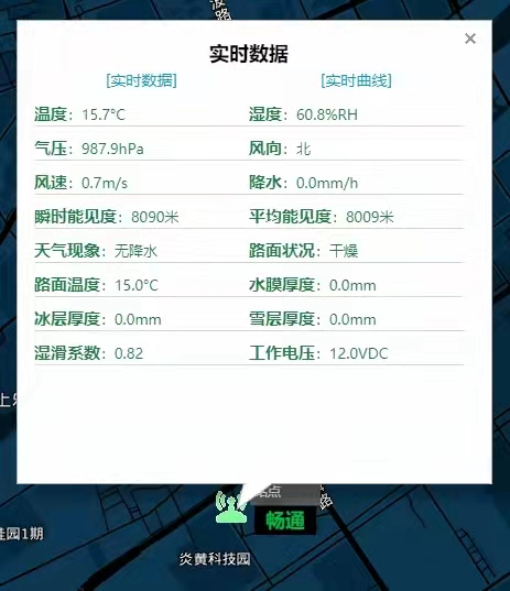 在監(jiān)測平臺中,實時數(shù)據(jù)主要展現(xiàn)數(shù)據(jù)有:溫度、氣壓、風(fēng)速、瞬時能見度、天氣現(xiàn)象、路面溫度、冰層厚度、濕滑系數(shù)、濕度、風(fēng)向、降水、平均能見度、路面狀況、水膜厚度、雪層厚度、工作電壓等,不同的氣象要素可根據(jù)需求進(jìn)行定制。