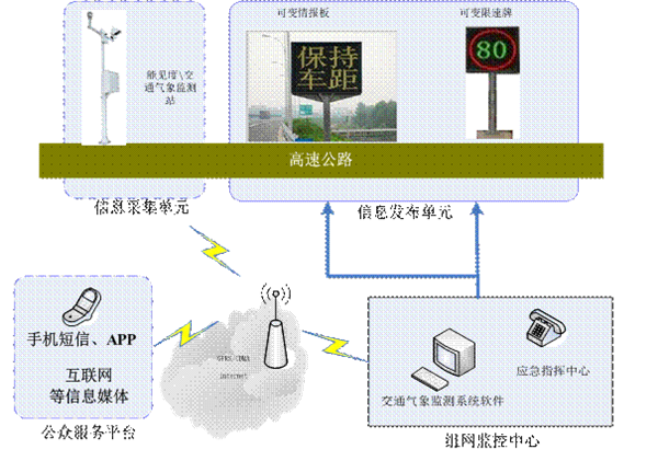 系統(tǒng)采用監(jiān)測(cè)組網(wǎng)運(yùn)行方式,連續(xù)獲得沿線多點(diǎn)的氣象信息情況,反饋給監(jiān)控中心,并將檢測(cè)數(shù)據(jù)與預(yù)定的判定條件比較,以確定是否有霧、冰雪等惡劣天氣;在確定惡劣天氣的情況下調(diào)用預(yù)定指標(biāo)庫(kù),通過(guò)將檢測(cè)數(shù)據(jù)與預(yù)定指標(biāo)庫(kù)比較,確定出檢測(cè)指標(biāo)的控制級(jí)別;***后,再根據(jù)指標(biāo)控制級(jí)別從預(yù)定策略庫(kù)中調(diào)用對(duì)應(yīng)的控制策略來(lái)應(yīng)對(duì)惡劣天氣對(duì)公路交通造成的影響,從而做到全天候保障公路交通的運(yùn)行。